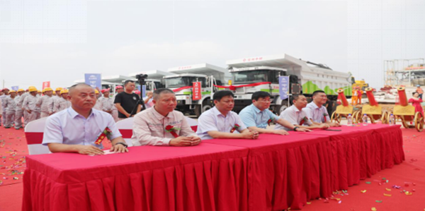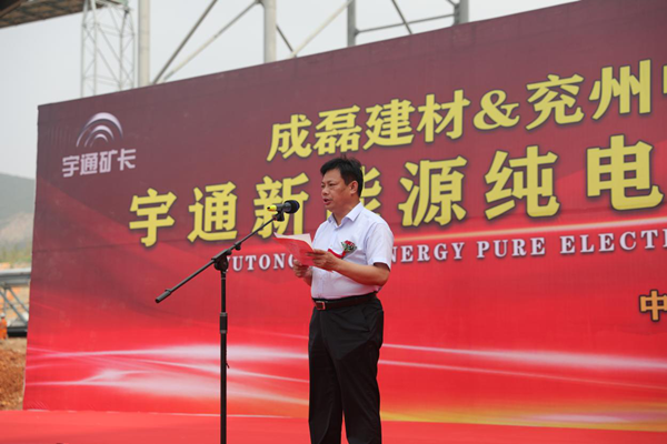 儀式現場彩旗飄飄,人聲鼎沸,場面氣氛熱烈而隆重。首先,宇通礦用裝備銷售公司總經理馬勇先生致詞,馬總介紹了宇通客車響應國家政策在新能源礦車領域擁有的先進技術和取得的市場成就,以及對兗州中材建設有限公司、禹州市成磊建材有限公司美好明天的祝福。隨后,兗州中材建設有限公司副總經理顏景祥先生上臺致詞,顏總強調,兗州中材建設有限公司作為中央企業是更具有社會責任感的企業,兗州中材在謀求發展的同時積極貫徹國家政策,在礦山施工中率先使用新能源設備,為構建“資源節約型、環境友好型”社會做出應有的貢獻,承擔央企責任,擔負央企職責。最后,禹州市成磊建材有限公司總經理張景奇先生致詞,張總肯定了兗州中材建設有限公司在礦山施工中采用更加安全環保新型設備的工作,期望兗州中材建設有限公司依靠過硬的施工技藝、新型的生產設備、高效的管理模式將禹州市成磊建材有限公司礦山在全省乃至全國范圍內樹立標桿,打造成示范性礦山。