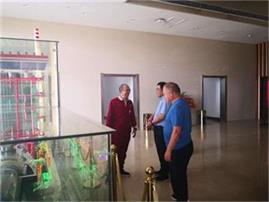 在礦山臨建生活區檢查過程中,郭總與業主山西國金電力有限公司董事長、總經理頡鈺進行友好的暢談,隨后郭總受頡鈺董事長邀請來到山西國金電力有限公司總部大樓,興致勃勃的參觀了正在使用世界首臺350MW超臨界循環流發電機組模型。