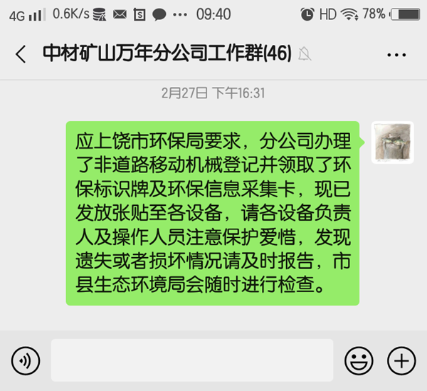 萬年分公司現(xiàn)有28臺套設(shè)備需要登記取證,經(jīng)過管理人員不懈努力,采集工作順利完成,經(jīng)市、縣環(huán)保部門的審核,分公司于2020年2月在萬年縣生態(tài)環(huán)境局領(lǐng)取非道路移動機械環(huán)保信息標示牌及環(huán)保信息采集卡。