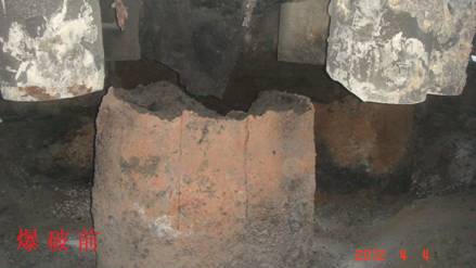 兗州中材建設(shè)有限公司云維項(xiàng)目部 實(shí)施石墨電極分解爆破 4月4日,應(yīng)云維乙炔化工有限公司(業(yè)主)要求,我項(xiàng)目部對(duì)其廠區(qū)1#電石爐內(nèi)石墨電極成功實(shí)施分解爆破。 本次爆破點(diǎn)位于業(yè)主電石車間二層電石爐內(nèi),技術(shù)人員和安全員經(jīng)現(xiàn)場(chǎng)勘查發(fā)現(xiàn):石墨電極為直徑1.2m、高約1.5m的圓柱狀石墨體,從中心呈輻射狀均勻分布12塊約1cm厚鋼板。三個(gè)電極呈“品”字狀分布在一個(gè)直徑約7~8米的幾乎密閉的鋼制反應(yīng)爐內(nèi)(有洞口)。爆前充分勘察了爆區(qū)周圍的實(shí)際情況,結(jié)合從網(wǎng)絡(luò)上搜集的對(duì)石墨電極的性能分析和以往的爆破經(jīng)驗(yàn),選用合適的爆破器材,擬定了幾種爆破方案。充分分析爆破方案的可行性后,選擇其中可行性較高的兩種方案進(jìn)行了試爆,結(jié)合兩次試爆效果,經(jīng)調(diào)整爆破參數(shù)后,最終成功拆除。 本次爆破對(duì)僅隔約10米遠(yuǎn)、正在生產(chǎn)的2#爐和庫房未產(chǎn)生任何影響。 這次爆破工作雖小,但我們本著謹(jǐn)慎、科學(xué)的態(tài)度對(duì)待。從爆破參數(shù)的選擇到安全警戒都認(rèn)真小心,取得了預(yù)想的效果。 通過這次爆破,積累了對(duì)巖石以外材料的爆破經(jīng)驗(yàn),也增加了我項(xiàng)目部尤其是年輕人工作技能。也到了業(yè)主的認(rèn)可。 孟永旺