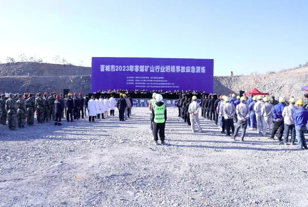 | 為進一步提升非煤礦山企業安全意識和應對突發事故的處置能力,晉城市 2023 年非煤礦山行業坍塌事故應急演練在晉城山水合聚水泥有限公司司家掌石灰巖礦(澤州分公司承建礦山)舉行。晉城市應急管理局、縣應急管理局、縣委宣傳部、縣衛健局、縣公安局、縣氣象局、縣消防救援大隊、縣自然資源局、晉城市救援救護隊、晉城市能源技術中心等 12 家單位120余人參與演練。市應急管理局三級調研員柳青、市應急管理局救援協調科邰建民、各縣區應急管理局負責人、分管負責人、非煤礦山行業相關科室負責人及全市所有非煤礦山企業主要負責人等 130 多人現場觀摩了演練。